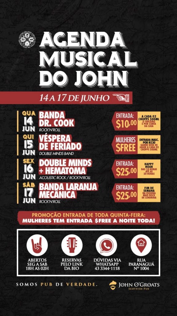 24 Out 2025 John O`Groats: O que você escuta em casa, você curte ao vivo aqui! Confira o line-up da semana aqui no John O’Groats. Garanta sua mesa acessando o link...