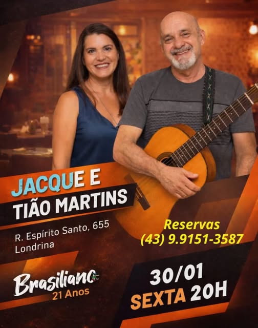 30 Jan 2026 Brasiliano: Jacque e Tião Martins Nesta sexta, o Brasiliano te espera para o Melhor Encontro entre a Boa Música e...
