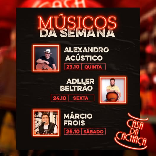 24 Out 2025 Casa da Cachaça: Boa comida e boa música! De quinta a sábado, o palco fica pequeno pra tanto talento e energia boa: Quinta:...