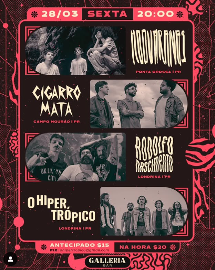 Ingressos antecipados via pix (R$15 / [email protected]), R$20 na portaria.