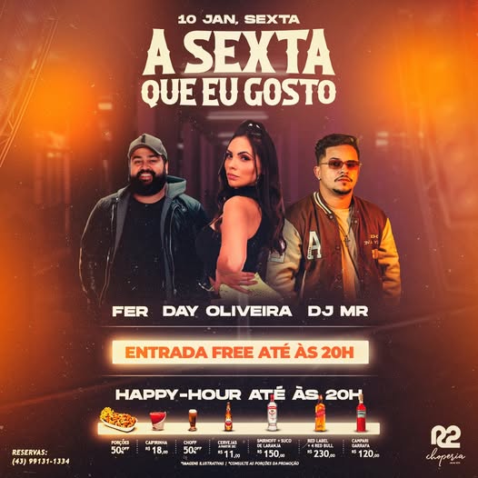 O final de semana oficialmente começou e nada melhor que curtir uma boa música ao vivo com DJ MR, Day Oliveira e Fer, além da entrada free e happy hour até as 20h. Sextou!