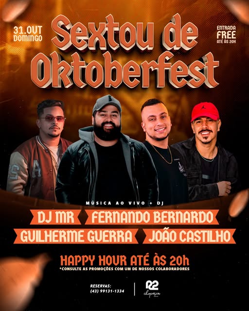 31 Out 2025 A Oktoberfest chegou na R2 Choperia! Prepare-se para um Sextou diferente, com muita festa e música! O palco vai ferver com...